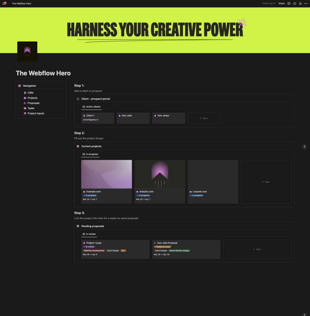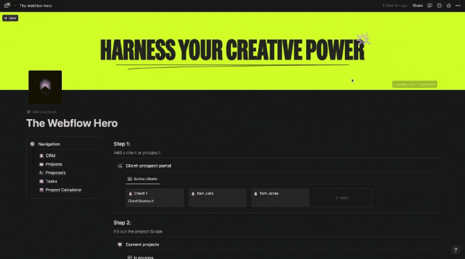Send proposals, manage your client pipeline, calculate project costs and scope without batting an eye. This template is perfect for designers and Webflow Hero's who need a centralized hub to manage their clients and prospects.
